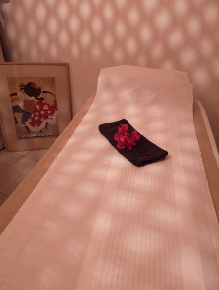 Le massage est pratiqué sur une table de soins confortable pouvant supporter 120kg Max.