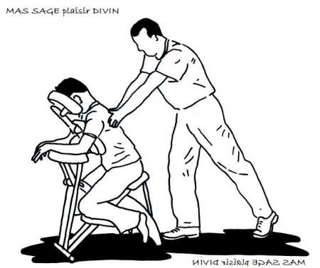 Massage sur chaise spécifique, la personne massée, habillée, reçoit un massage par-dessus ses vêtements de la face dite "arrière" (face côté dos) de la tête jusqu'au bassin.